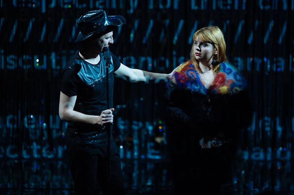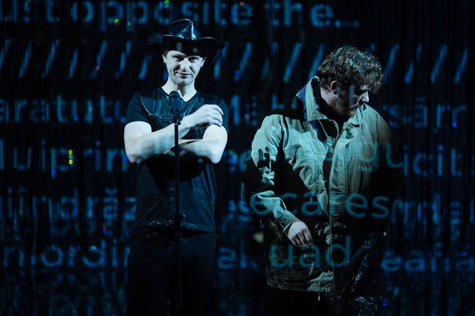 Ei bine, „conferința” este, de fapt, un spectacol în care publicul participă activ cel mult cu o reacție (așa că, introvertiții pot să stea liniștiți!). Concret, piesa aduce în fața spectatorilor șase scene inspirate din astfel de „discuții ale artiștilor cu publicul”. Piesa se joacă cel mai mult în limba engleză, dar sunt și scene în limbile română și franceză, franceza fiind, parcă, anume inserată pentru actorul Bogdan Zamfir, absolvent al École Supérieure d’Acteurs du Conservatoire Royal de Liège, acest spectacol fiind prima producție românească de teatru în care joacă. Recomandarea mea ar fi să vedeți piesa dacă limba engleză vă este cel puțin… confortabilă. Deși există subtitrare, sunt anumite nuanțe pe care le prind doar cei care… gândesc direct în limba engleză. Oricum, faptul că montarea este atât de… internațională, face ca „Artists Talk” sa fie un spectacol cu potențial de export la festivalurile care, probabil, o așteaptă deja pe Gianina Cărbunariu.